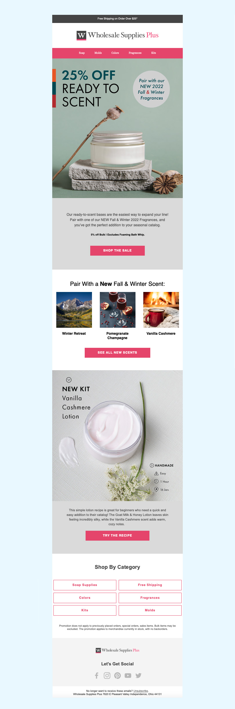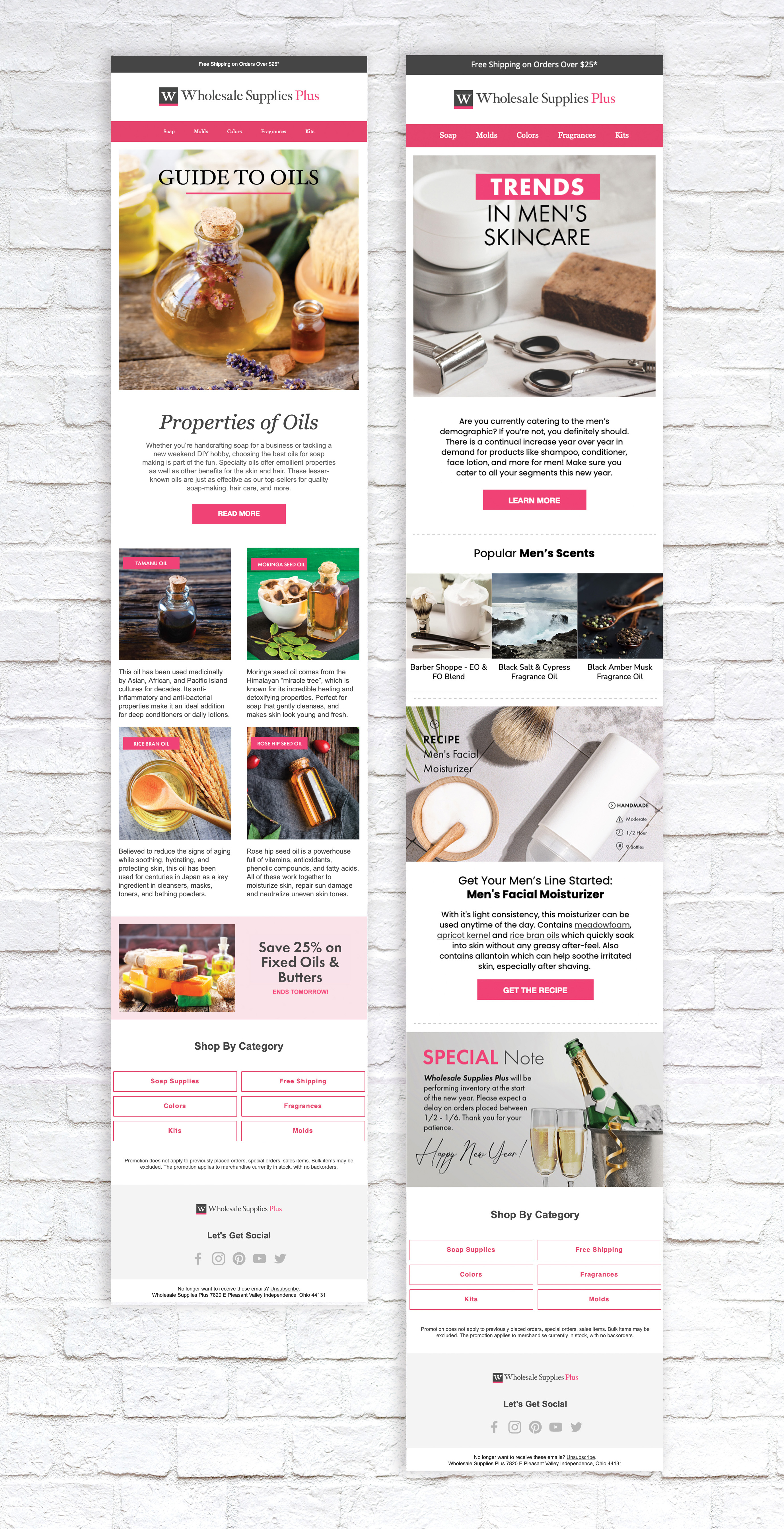 At Wholesale Supplies Plus, I’ve supported the full email marketing process—writing and designing campaigns that align with seasonal trends and product launches. Over time, my role has shifted toward email design, focusing on cohesive visuals, clear messaging, and strong calls to action to drive engagement. I also create content-rich emails with formulation tips, fragrance highlights, and creative inspiration to keep makers informed and connected to the brand.