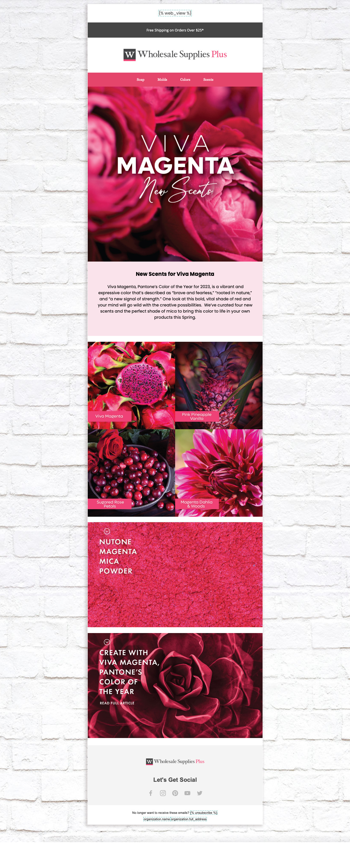Launched in February 2023, this campaign was inspired by Pantone’s Color of the Year, Viva Magenta. I led the email marketing design and strategy, creating visually cohesive emails that connected the color trend with our new fragrance collection. The goal was to educate customers on seasonal color inspiration and help them make informed purchasing decisions while developing new product lines aligned with market trends.